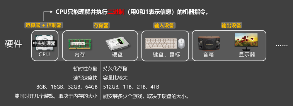 内存:暂时性存储,读写速度快,但容量通常不如硬盘大(8GB、16GB、32GB、64GB 等)。