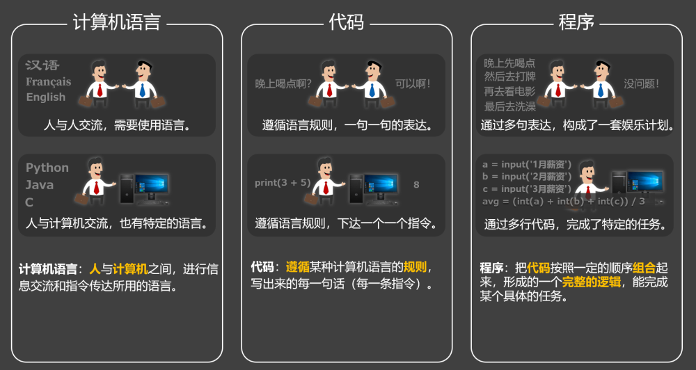 计算机语言是人类与计算机进行『交互』和『指令传达』所使用的一种形式化语言。比如:人与人之间,需要使用各种语言进行交流,那人与计算机之间,同样也需要语言进行沟通。