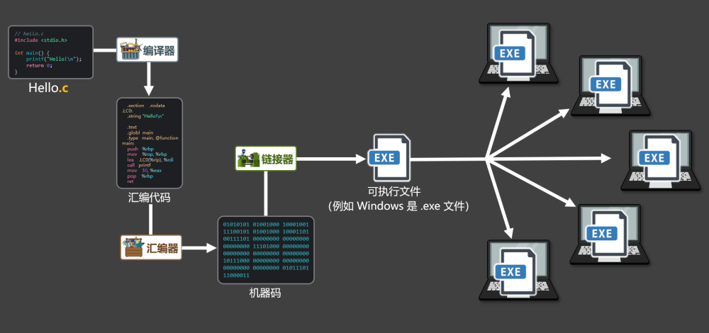 将程序翻译成计算机能理解的二进制内容,并且通常会生成一个可执行文件,例如在 windows 系统上生成的可执行文件是.exe文件,常见的『编译型』语言有:C、C++、Go、Rust 等。
