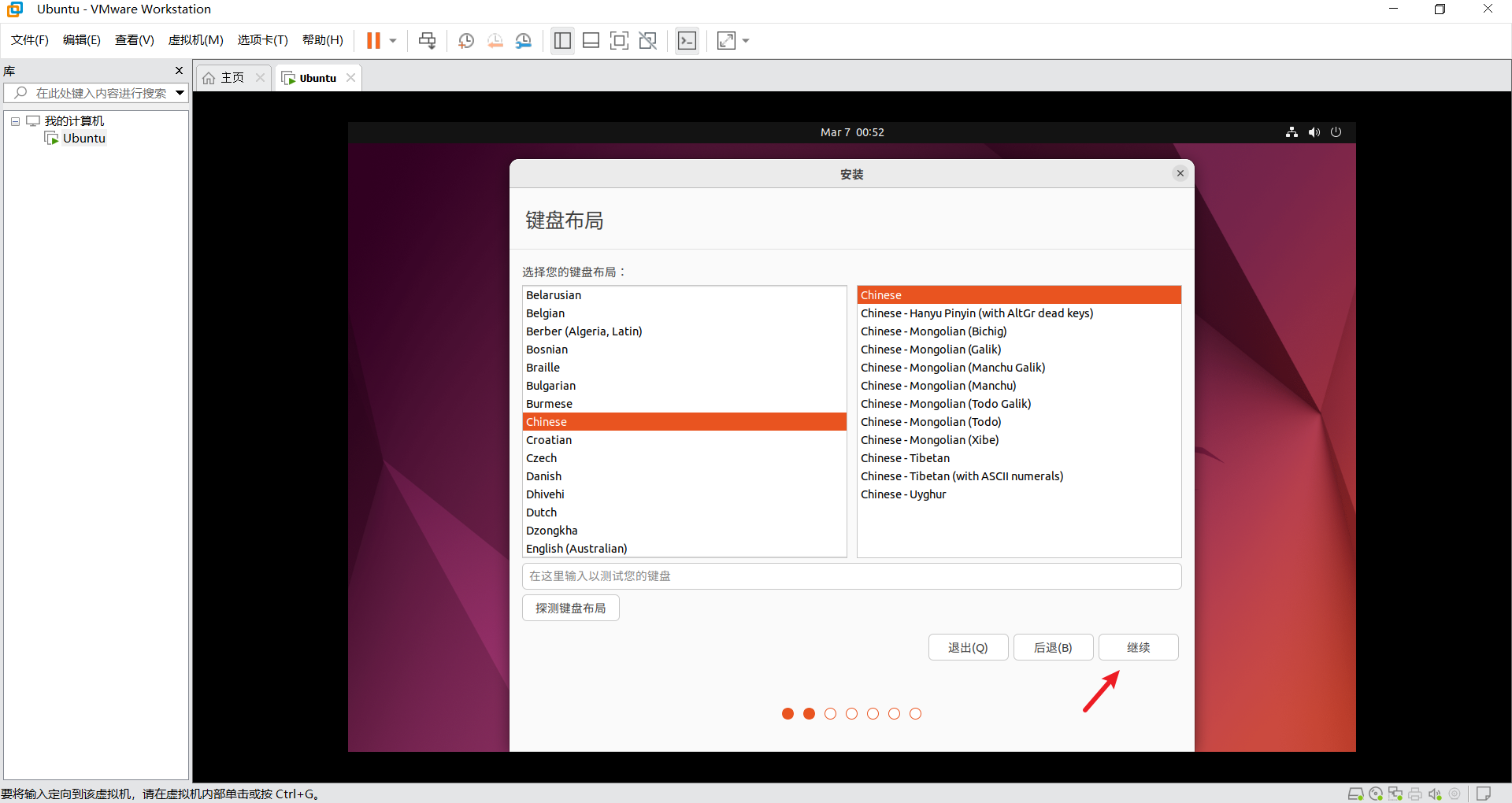 选择安装过程中使用的语言,建议选择 Chinese 作为默认键盘布局,后续可在系统内安装中文输入法。