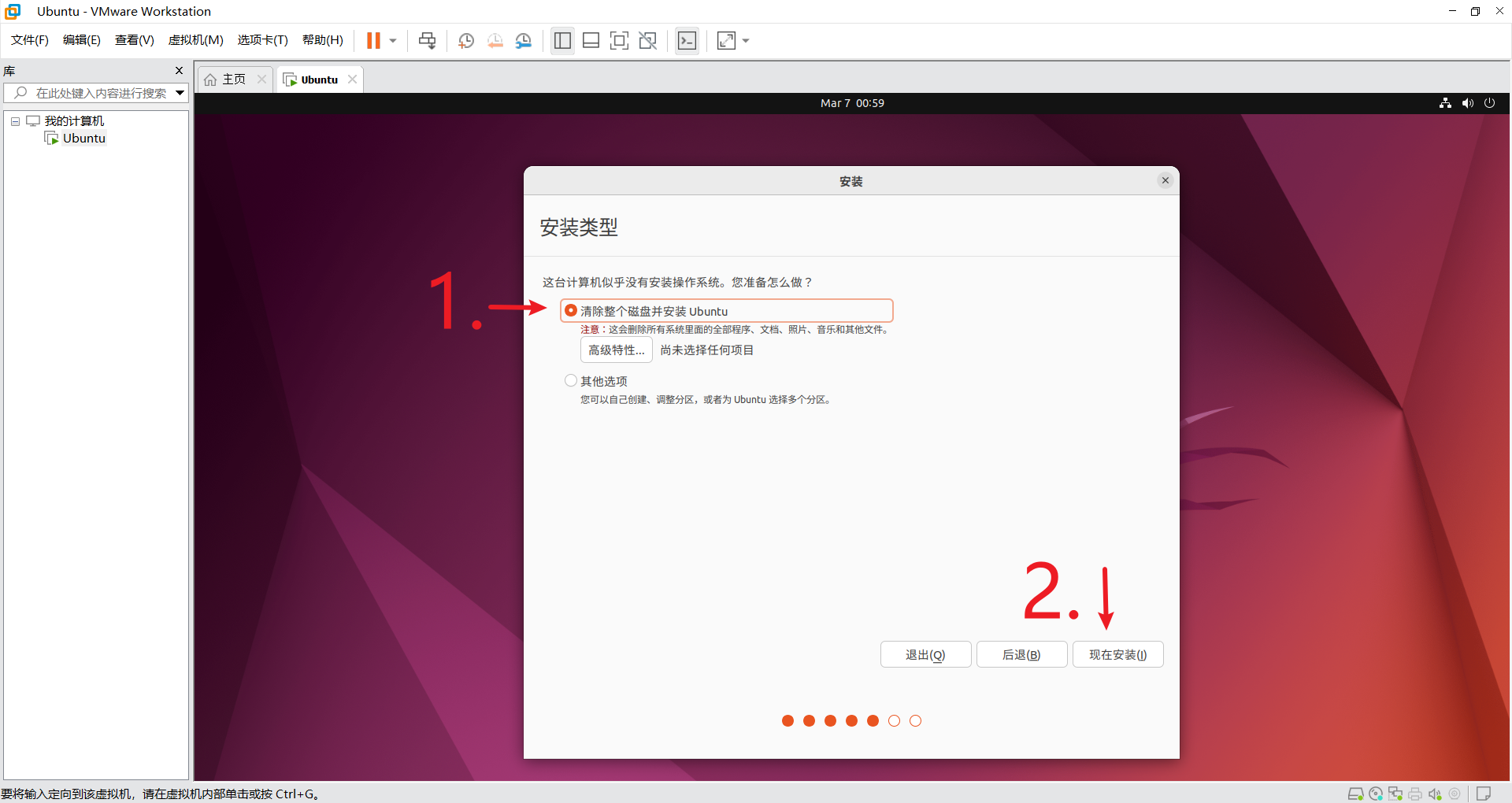 默认选择 “清除整个磁盘并安装Ubuntu”。