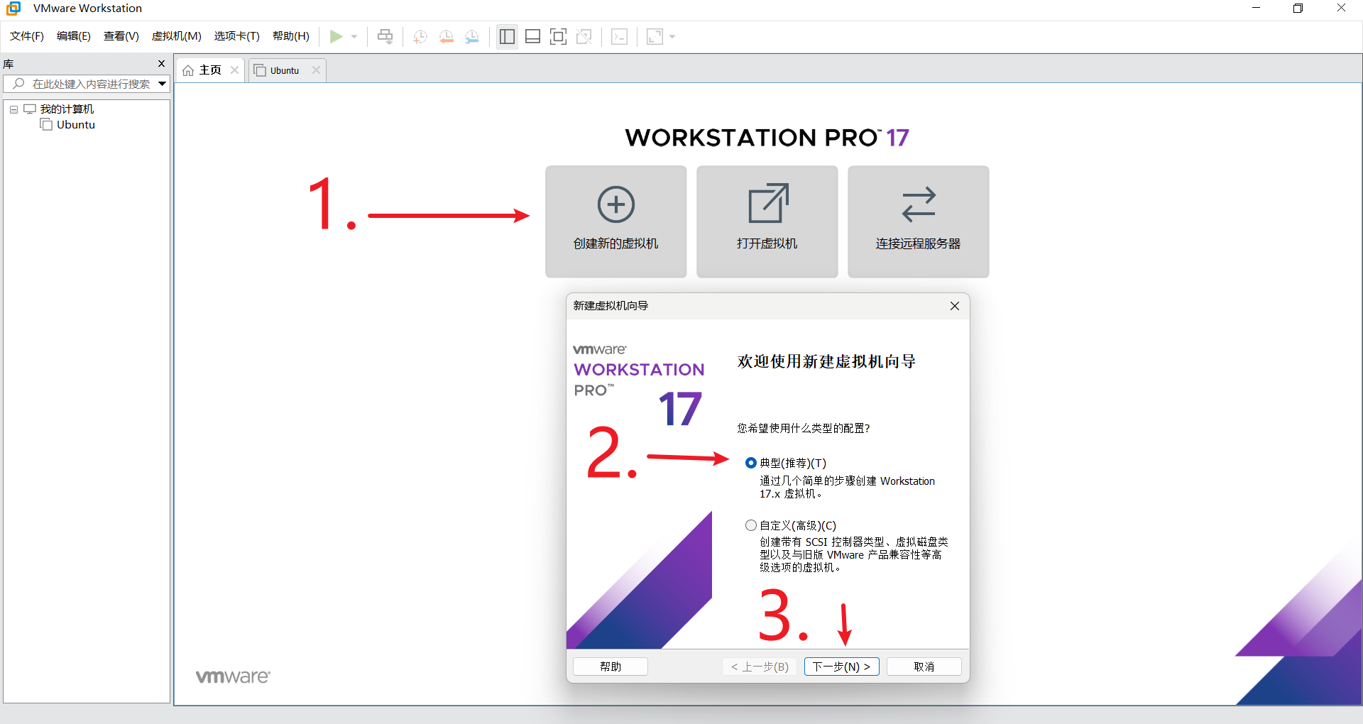 在新建虚拟机向导中,选择“典型(推荐)”并点击“下一步”。