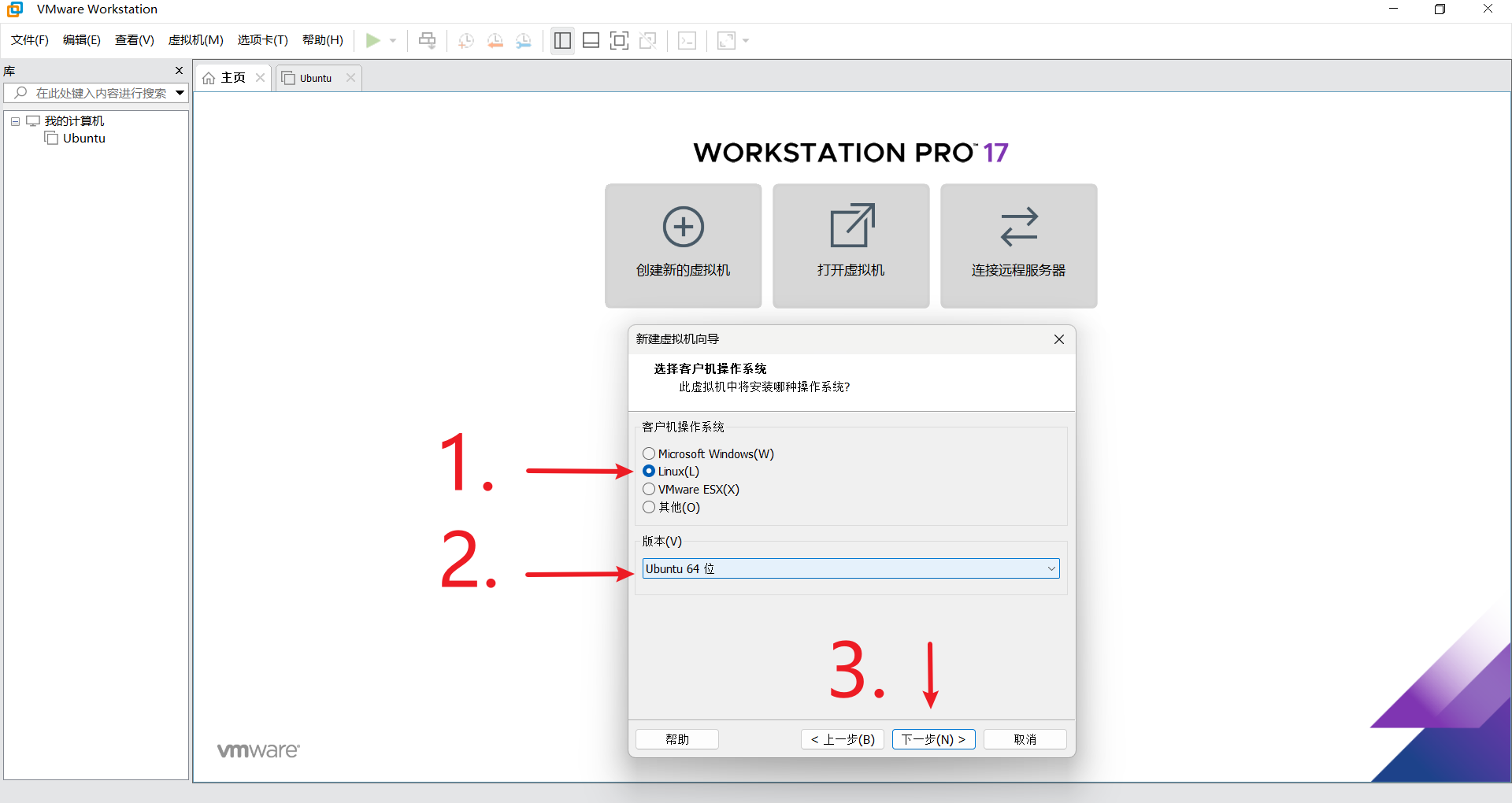 在“客户机操作系统”选择界面,选择“Linux”并在版本中选择“Ubuntu 64 位”,然后点击“下一步”。