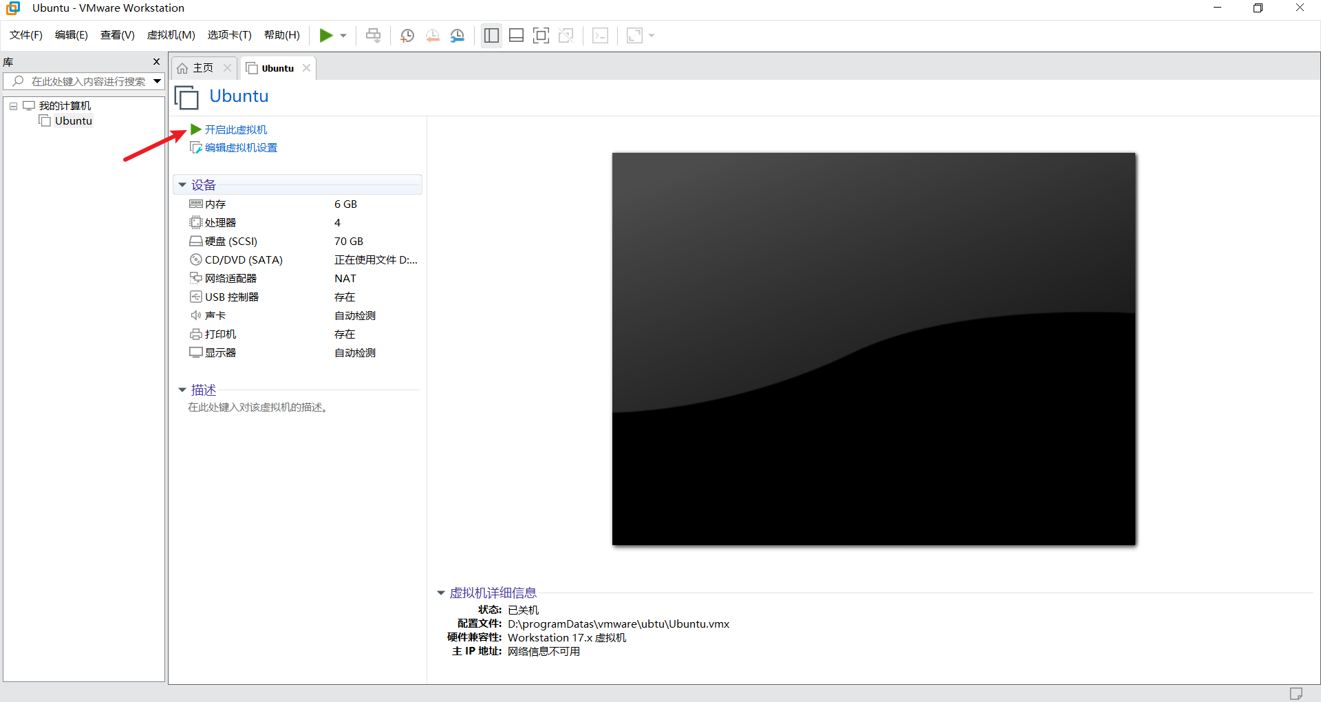 选择虚拟机并点击“启动此虚拟机”,虚拟机将从 ISO 镜像文件启动。