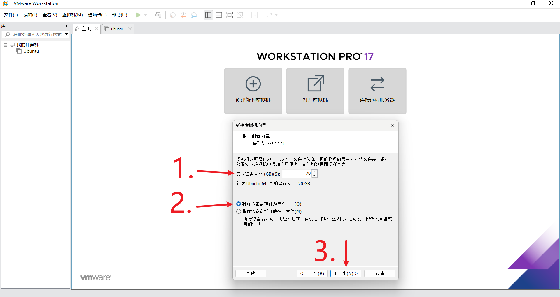 设置磁盘大小(建议至少 20GB),然后点击“下一步”。
